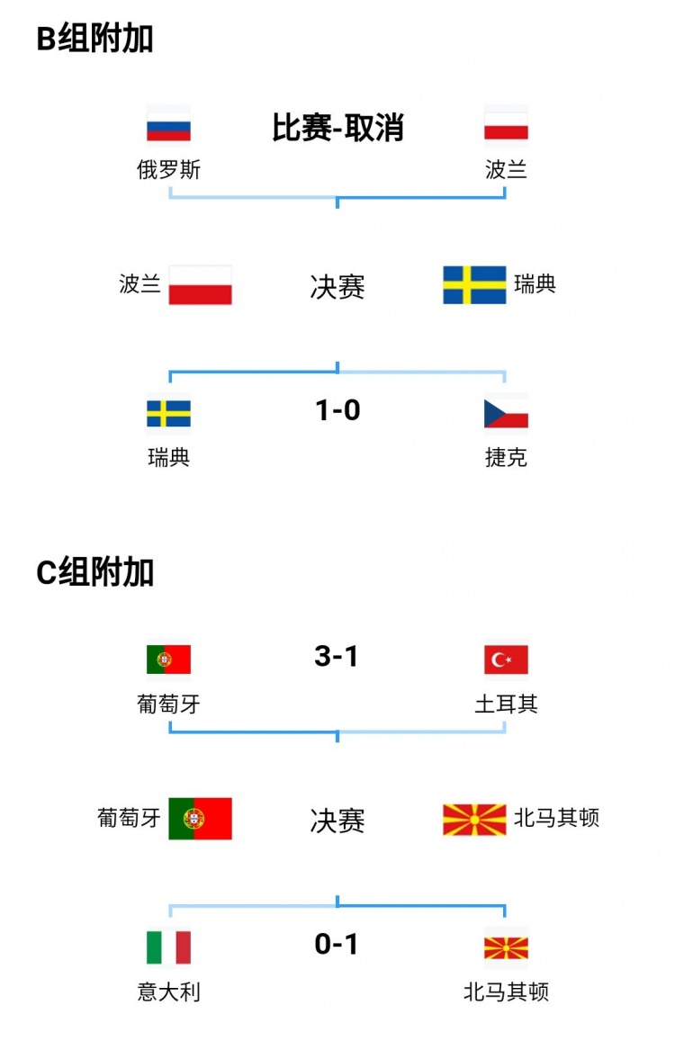 1、世欧预附加赛(2个):B组决赛(波兰vs瑞典)、C组决赛(葡萄牙vs北马其顿)3月30日2点45进行